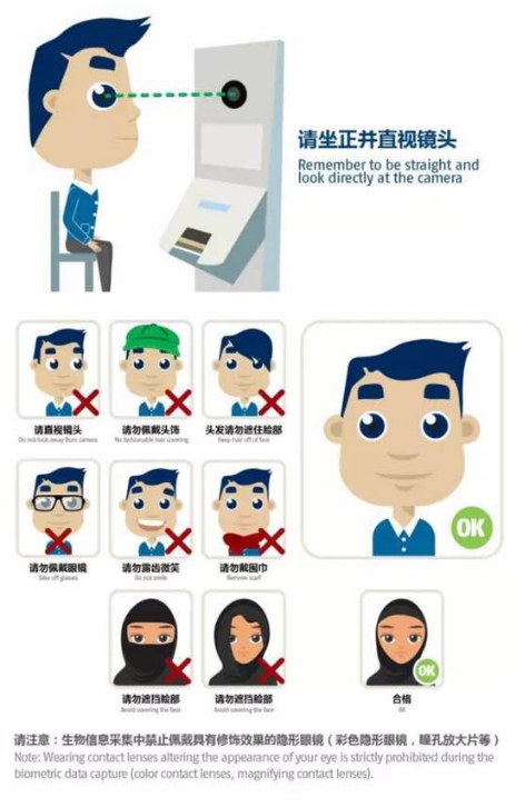 3.照相着装要求:手指保持干净;保持面部整洁,避免浓妆;不要佩戴隐形眼镜或美瞳;摘除耳饰及发饰、围巾、外套;头发不能遮挡面部(刘海)。(无需拍照的国家:奥地利,捷克,意大利,德国,其余当场均需指纹采集+拍照)