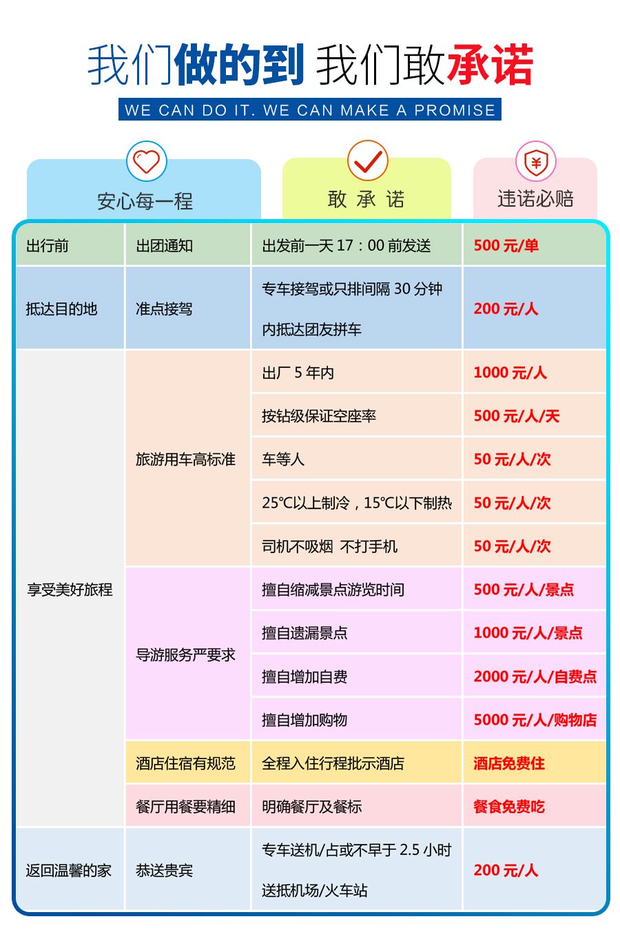 说明:1、如遇景点不正常对外开放,造成无法游览,不在此赔付范围内。