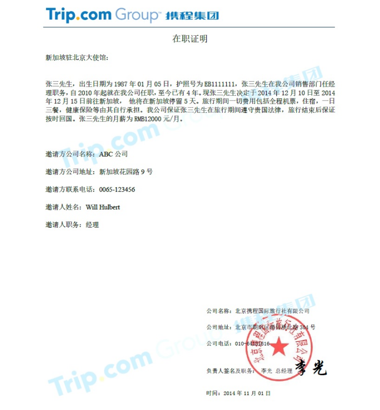 _________先生/女士/小姐(请客人根据自己实际情况选择一种称谓)出生日期_______护照号为_______,_______先生/女士/小姐(请客人根据自己实际情况选择一种称谓)在我公司_________部门任________职务,自_______年起就在我公司任职,至今已有_____年。现______先生/女士/小姐(请客人根据自己实际情况选择一种称谓)决定于 至 前往 ,他/她(请按实际选择)将在 停留_ __天。旅行期间一切费用包括全程机票,住宿,一日三餐,健康保险等由其自行承担。我公司保证_______先生/女士/小姐(请客人根据自己实际情况选择一种称谓)在旅行期间遵守贵国法律,旅行结束后保证按时回国。__________先生/女士/小姐(请客人根据自己实际情况选择一种称谓)的月薪为RMB__________元/月。