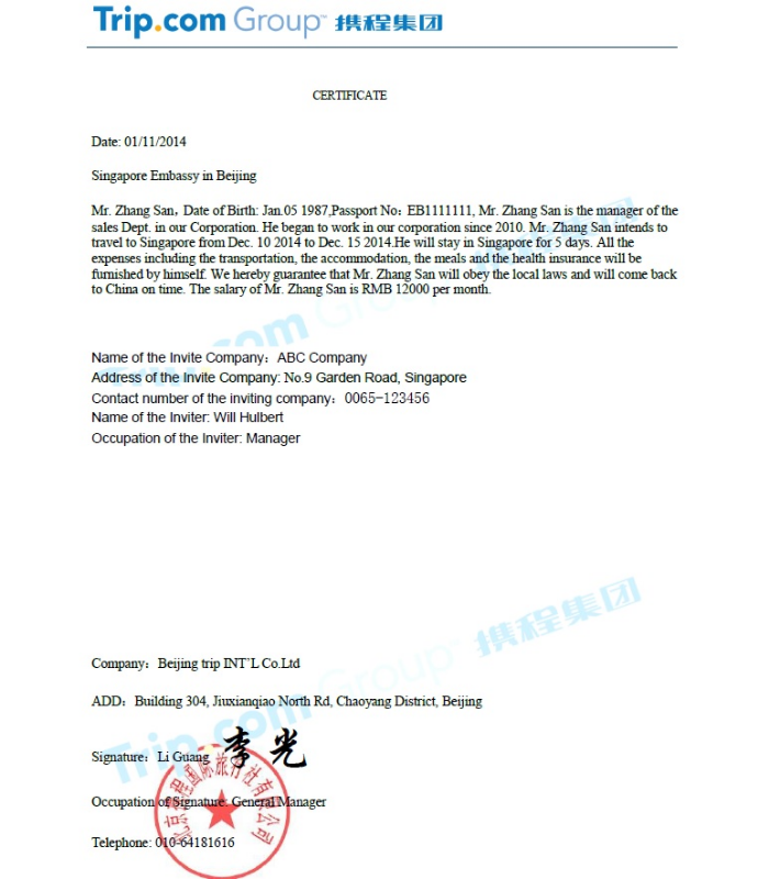 Mr./Ms./Miss(请按实际选择)(申请人英文姓名以拼音形式拼写),Date of Birth:(出生日期按年月日格式)Passport No: (护照号), Mr./Ms./Miss(请按实际选择)(申请人英文姓名以拼音形式拼写)is the (现职务)of the (所在部门)Dept. in our Corporation. He/She(请按实际选择) began to work in our corporation since(入职时间) . Mr./Ms./Miss(请按实际选择)(申请人英文姓名以拼音形式拼写intends to travel to (申请签证国家名称)from (出行时间具体到年月日) to( 回国时间具体到年月日)He/She(请按实际选择) will stay in(申请签证国家名称)for(停留天数)days. All the expenses including the transportation, the accommodation, the meals and the health insurance will be furnished by himself/herself(请按实际选择). We hereby guarantee that Mr./Ms./Miss(请按实际选择)(申请人英文姓名以拼音形式拼写)will obey the local laws and will come back to China on time. The salary of Mr./Ms./Miss (请按实际选择)(申请人英文姓名以拼音形式拼写)is RMB(月收入)per month.
