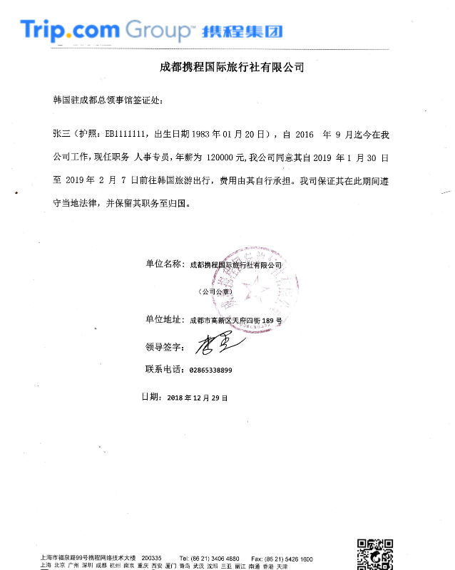 申请人姓名(护照:申请人护照号,出生日期(格式年/月/日),自入职时间(格式:年/月)迄今在我公司工作,现任职务职务名称,年薪为年薪金额元,我公司同意其自出发日期(格式:年/月/日)日至 返回日期(格式:年/月/日)前往出行目的地旅游出行,费用由其自行承担。我司保证其在此期间遵守当地法律,并保留其职务至归国。