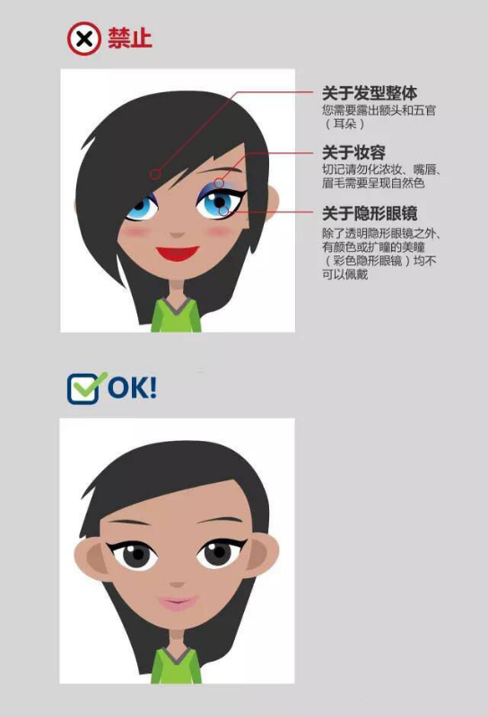 8、着装打扮要求:手指保持干净、保持面部整洁,避免浓妆、不要佩戴隐形眼镜/美瞳、摘除耳饰/发饰、围巾/外套、头发不能遮挡面部(刘海)