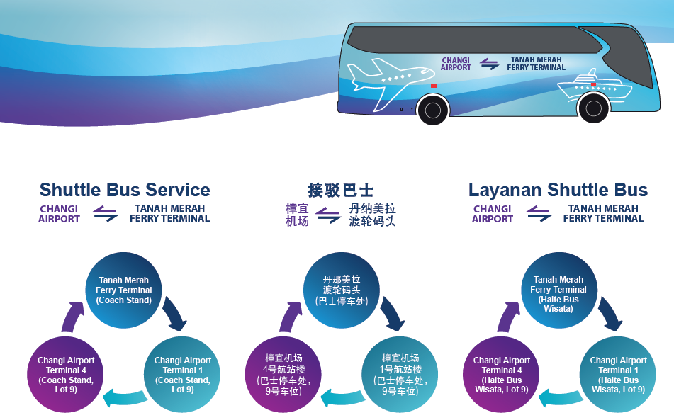 4、欲了解更多信息,请前往樟宜机场或丹那美拉渡轮码头到达大厅的任何咨询柜台询问。