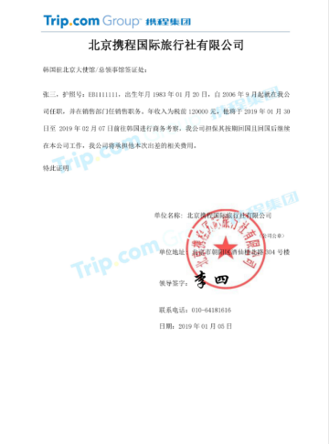 (请用中文填写本人姓名)护照号:请填写本人护照号码,出生日期(请填写本人出生日期),自(请填写在该公司开始工作的年、月)起就在我公司任职,并在(请填写您任职的部门名称)部门任(请填写现任职务的名称)职务,年收入为税前(请填写目前年薪)元,(请用中文填写本人姓名)将于(请填写旅行出发的年、月、日)至(请填写旅行结束的年、月、日)前往(请填写出行国家的名称)(请填写赴韩的商务目的),我司担保其保证其按期回国且回国后继续在本公司工作,我公司将承担(请用中文填写本人姓名)本次出差的相关费用。