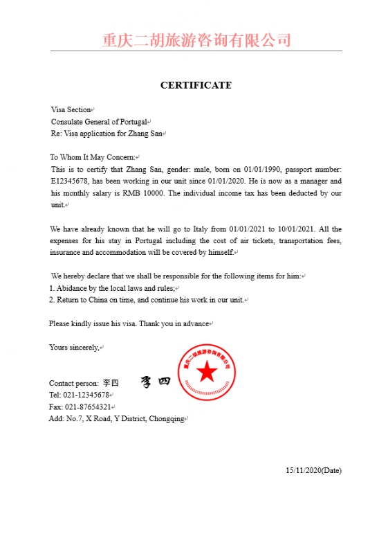 旅游网预订 > 在职证明样本(葡萄牙)—二胡签证